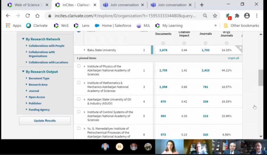 “Clarivate Analytics” şirkətinin Təhsil proqramları şöbəsinin müdiri Valentin Boqorov pandemiya şəraitinə baxmayaraq 2020-ci ilin birinci yarısında BDU alimlərinin beynəlxalq indeksli jurnallarda çap olunan elmi məqalələrinin artan dinamikasını görüş iştirakçılarının nəzərinə çatdırıb.