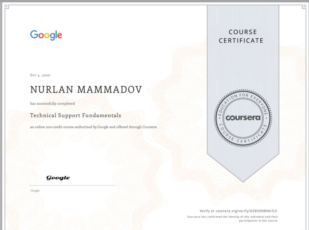Məlumat üçün bildirək ki, N. Məmmədov bu il oktyabr ayının 3-də “Google” koorporasiyasının İnformasiya Texnologiyaları (İT) üzrə beynəlxalq sertifikatını alıb. O, “Google” tərəfindən keçirilən “İT üzrə texniki dəstəyin əsasları” kursunu tam həcmdə, 98.78% bal ilə yüksək nəticə göstərərək informasiya təhlükəsizliyi, kibertəhlükəsizlik, əsas şifrələnmə alqoritmləri və verilənlərin mühafizəsi mövzularında nəzəri, praktik tapşırıqları müvəffəqiyyətlə başa vurub.