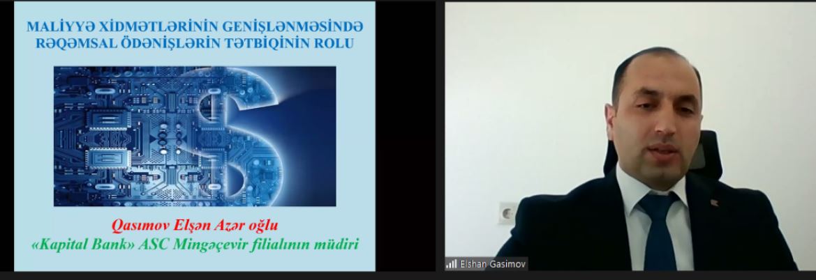 Tədbirdə çıxış edən “Kapital Bank” ASC Mingəçevir filialının müdiri Elşən Qasımov MDU-nun tələbə, magistrant və professor-müəllim heyəti ilə görüşməkdən məmnun olduğunu söyləyib. “Maliyyə xidmətlərinin genişlənməsində rəqəmsal ödənişlərin tətbiqinin rolu” mövzusundakı təqdimatında E.Qasımov rəqəmsal ödənişlərin üstünlükləri, alətləri, “Kapital Bank” ASC-nin bu istiqamətdə müştərilərə yaratdığı imkanlar, göstərdiyi xidmətlər, məlumatların qorunması, əməliyyatların təhlükəsizliyi və digər məsələlər haqqında ətraflı məlumat verib.