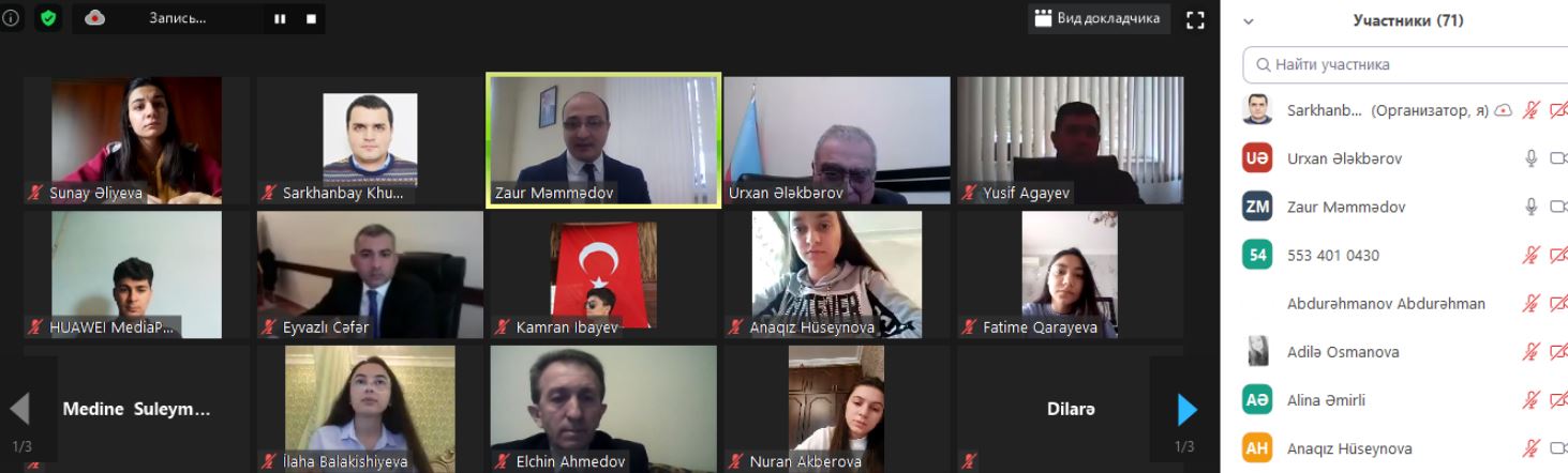Dövlət İdarəçilik Akademiyasının professoru, siyasi elmlər doktoru Elçin Əhmədov “Azərbaycanın hərbi-diplomatik uğurları və Ermənistanın dövlət terrorizmi siyasəti” movzusundakı çıxışında bildirib ki, 44 günlük Vətən müharibəsində xalqımız bütünlüklə Müzəffər Ali Baş Komandanın ətrafında səfərbər oldu. Torpaqlarımızın hər qarışının azad edilməsi uğrunda gedən döyüşlər, qüdrətli ordumuzun şanlı tarix yazaraq düşmən üzərindəki sarsıdıcı zərbələri, eləcə də bir sıra mühüm əhəmiyyətli şəhərlər, yaşayış məntəqələri, həmçinin müxtəlif istiqamətlərdəki strateji yüksəkliklərin işğalçılardan azad edilməsi xalqımızda böyük inam və ruh yüksəkliyi yaratdı:” Xüsusilə 2020-ci il noyabrın 8-i tariximizə ən şanlı bir gün kimi yazıldı. Ali Baş Komandan İlham Əliyevin rəhbərliyi ilə rəşadətli ordumuz Azərbaycanın tarixi, mədəni və strateji əhəmiyyətə malik, Qarabağın baş tacı olan Şuşa şəhərini işğalçılardan azad etdi. Azərbaycanın hərbi-diplomatik uğurları, xüsusilə strateji əhəmiyyətli Şuşa şəhərinin azad edilməsi müharibənin sonrakı gedişinə və taleyinə ciddi təsir göstərdi. Bununla yanaşı, Azərbaycan Prezidenti İlham Əliyevin hər zaman torpaqlarımızın işgaldan azad edilməsi istiqamətində qətiyyətli və prinsipial movqeyi Azərbaycanın ikinci Qarabağ müharibəsindəki hərbi-diplomatik qələbəsi ilə nəticələndi. Eyni zamanda, Prezident İlham Əliyevin bir sıra xarici kütləvi informasiya vasitələrinə verdiyi çoxsaylı müsahibələr informasiya məkanında da düşmənin yalan üzərində qurulmuş təbligat maşınına ağır zərbə vurdu və Ermənistanın təcavüzkar siyasətinin, eləcə də onun himayədarlarının ifşa olunması ilə nəticələndi”.