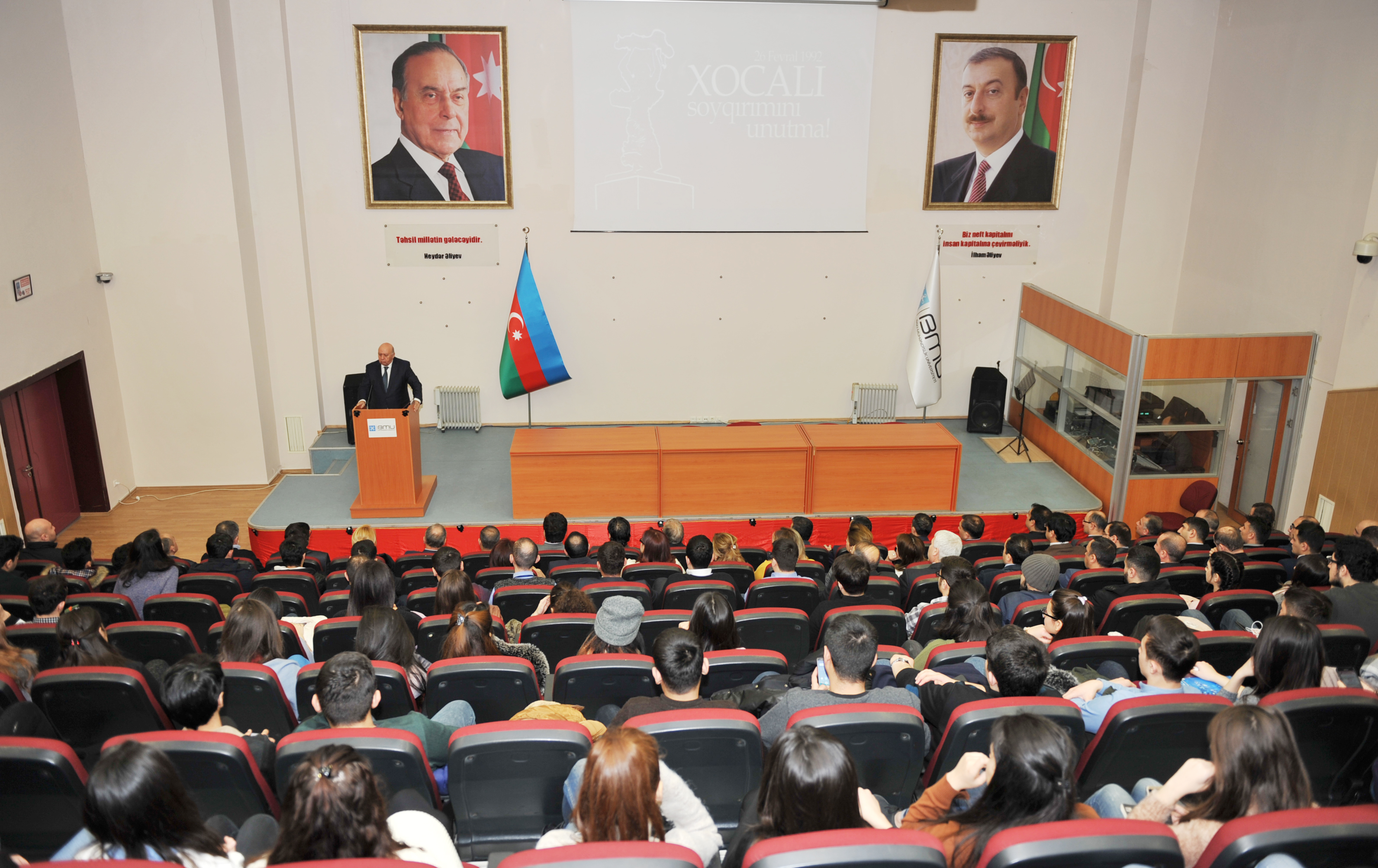 Tədbiri giriş sözü ilə açan universitetin rektoru, professor Havar Məmmədov bildirib ki, 200 ildən bəri davam edən Ermənistanın Azərbaycana olan ərazi iddiaları və təcavüzləri Dağlıq Qarabağ münaqişəsi dövründə ən faciəli həddə çatmış və tarixdə analoqu çox az olan hadisələrdən biri Xocalıda baş vermişdir. Xocalı faciəsi XX əsrin ən dəhşətli və ən qəddarcasına törədilmiş Xatın, Xirosima faciələri ilə bir sırada durur. Belə ki, bir gecənin içində qədim Xocalı şəhəri yerlə-yeksan edilmişdir. Şəhəri tərk etməyə məcbur olan əhali yollar nəzarətə götürüldüyündən dağlara, meşələrə qaçmışdır. Hər tərəfdə silahlı ermənilər dinc əhalini güllələmiş, onlara amansız divan tutmuşlar. Soyuq, qarlı fevral gecəsində yüzlərlə soydaşımız donaraq və düşmən gülləsinə tuş gələrək şəhid olmuş, əsir düşmüş, girov götürülmüşdür. Rektor qeyd edib ki, Xocalı hadisələri əsl soyqırımıdır. Xocalıda öldürülən yüzlərlə insandan 56 nəfəri xüsusi qəddarlıqla və amansızlıqla qətlə yetirilmişdir. Ermənilər hətta meyitlərə də işgəncə vermişdir ki, bu da insanlıqla bir araya sığmayan hərəkətdir. Azərbaycan xalqı və dövləti Xocalı faciəsini heç vaxt unutmur və unutmayacaqdır. Ulu öndər Heydər Əliyev 1 mart 1994-cü ildə Xocalı ilə əlaqədar xüsusi fərman vermişdir. Azərbaycan Respublikası Milli Məclisinin qərarı ilə 26 fevral - Xocalı soyqırımı və milli matəm günü elan olunmuş, bu barədə bütün beynəlxalq təşkilatlara məlumat verilmişdir. 25 fevral 1997-ci ildə isə “Xocalı soyqırımı qurbanlarının xatirəsinə sükut dəqiqəsi elan edilməsi haqqında” həmin dövrdə Azərbaycan Respublikasının Prezidenti olan ulu öndər Heydər Əliyev tərəfindən fərman imzalanmışdşr. Xocalı faciəsi ulu öndərin ikinci dəfə ölkəmizə rəhbərlik etməyə başladığı vaxtdan hüquqi–siyasi qiymətini almış və dünya ictimaiyyətinin diqqətinə çatdırılmışdır.