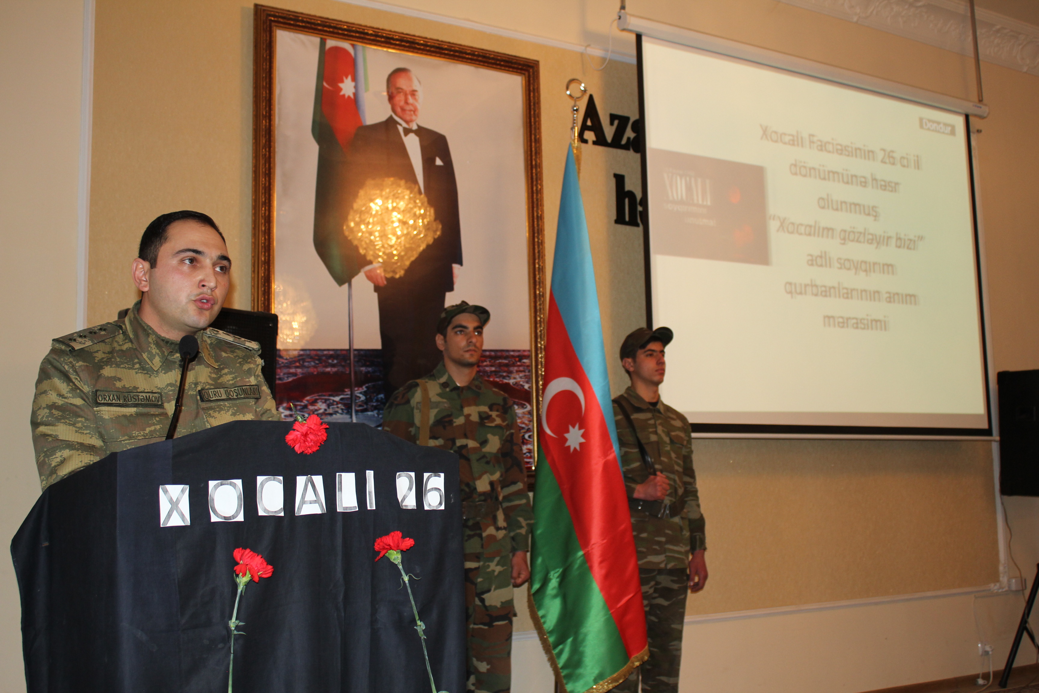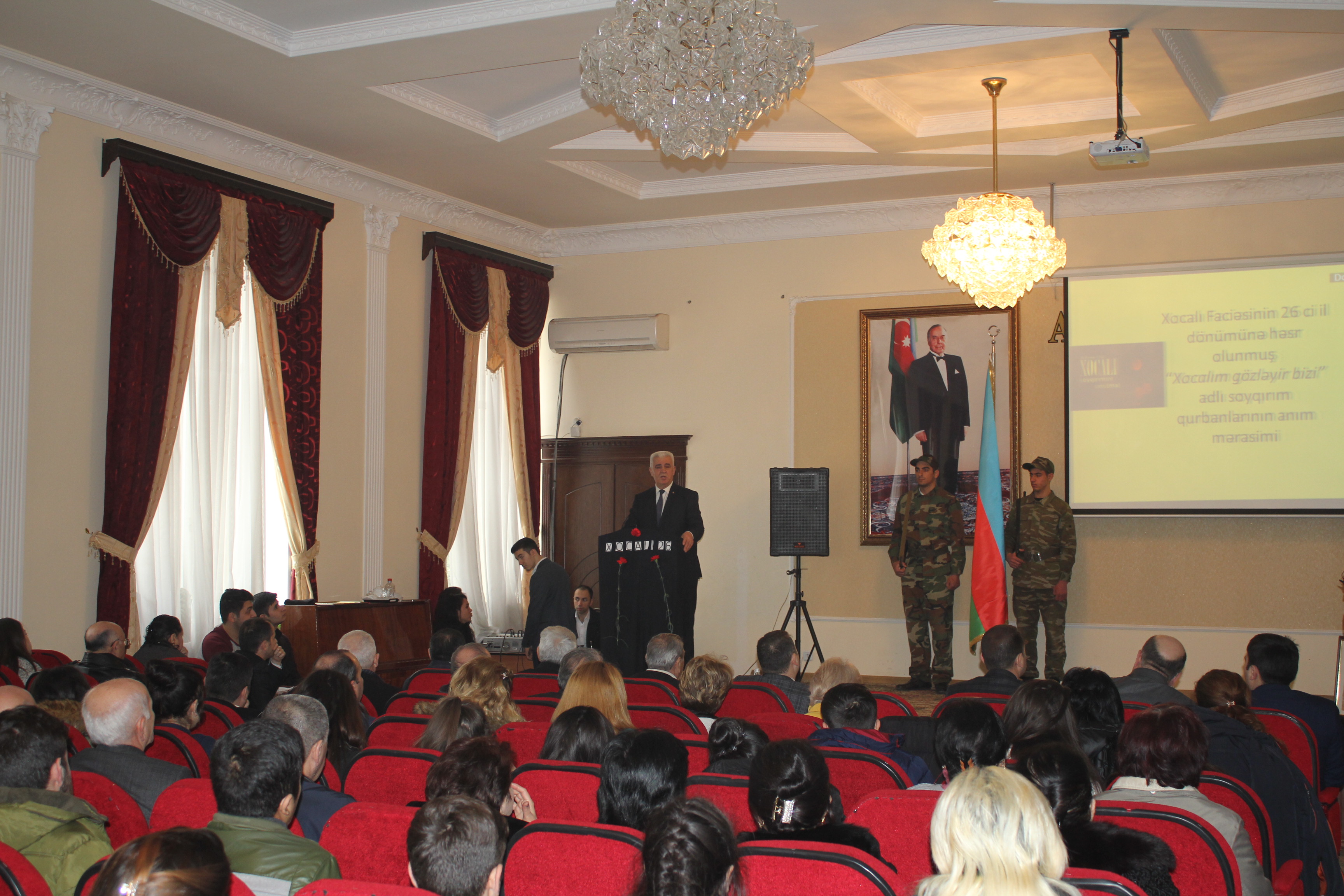 Mərasimi açan rektor, professor Akif Süleymanov bildirib ki, 1992-ci il fevralın 25-dən 26-na keçən gecə Ermənistan hərbi birləşmələrinin Xankəndində yerləşən 366-cı alayın köməyi ilə törətdiyi Xocalı soyqırımı və ermənilərin digər qanlı cinayətləri yaddaşlarımızdan heç vaxt silinməyəcək. Çünki Xocalıda baş verənlər təkcə Azərbaycan xalqına qarşı soyqırımı deyil, bəşəriyyətə qarşı yönəldilən qanlı cinayətdir. Xocalıda bircə gecədə öldürülmüş 613 nəfər arasında 106 qadın, 63 uşaq, 70 ahılın olması bunun sübutudur. Rektor qeyd edib ki, bu faciənin geniş ictimaiyyətə çatdırılması üçün Azərbaycan xalqının ümummilli lideri Heydər Əliyevin hakimiyyətə qayıdışından sonra məqsədyönlü işlər görülməyə başlanıb. Məhz onun təşəbbüsü ilə Azərbaycan Respublikasının Milli Məclisində ilk dəfə bu məsələyə siyasi qiymət verilib, faciənin dünya ictimaiyyətinə çatdırılması tədbirlərinə başlanıb.