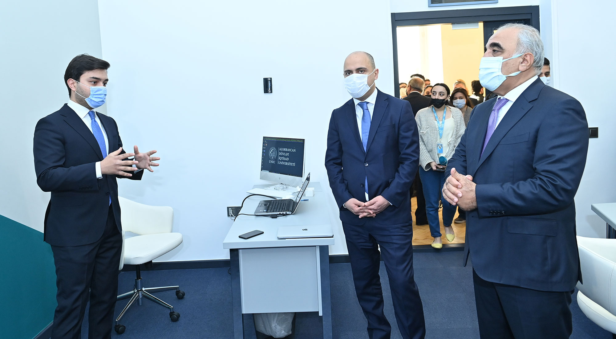 Sonra təhsil naziri Emin Əmrullayev UNEC-in 7/24 kitabxanası və Ekstern Mərkəzi ilə tanış olub. Nazirə kitabxana, oxu zalı, Mərkəz barədə ətraflı məlumat verilib. Emin Əmrullayev UNEC-də yaradılan hibrid auditoriyalara da baxış keçirib. Universitetdə hazırda 50 hibrid auditoriyanın fəaliyyət göstərdiyi, daha 50 auditoriyanın da yaxın zamanlarda istifadəyə veriləcəyi nazirin diqqətə çatdırılıb.