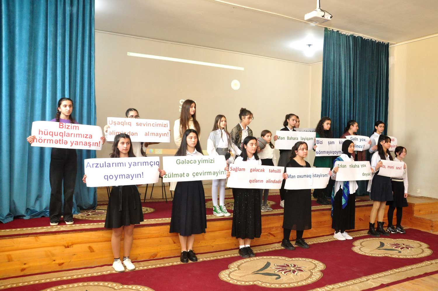 Məktəblilər məişət zorakılığı, uşaq evliliyi, təhsildən yayınma halları, qohumlar arasındakı nikah və onların fəsadları mövzuları ilə bağlı hazırladıqları səhnəcikləri nümayiş etdirib, şeir və mahnılar səsləndiriblər.