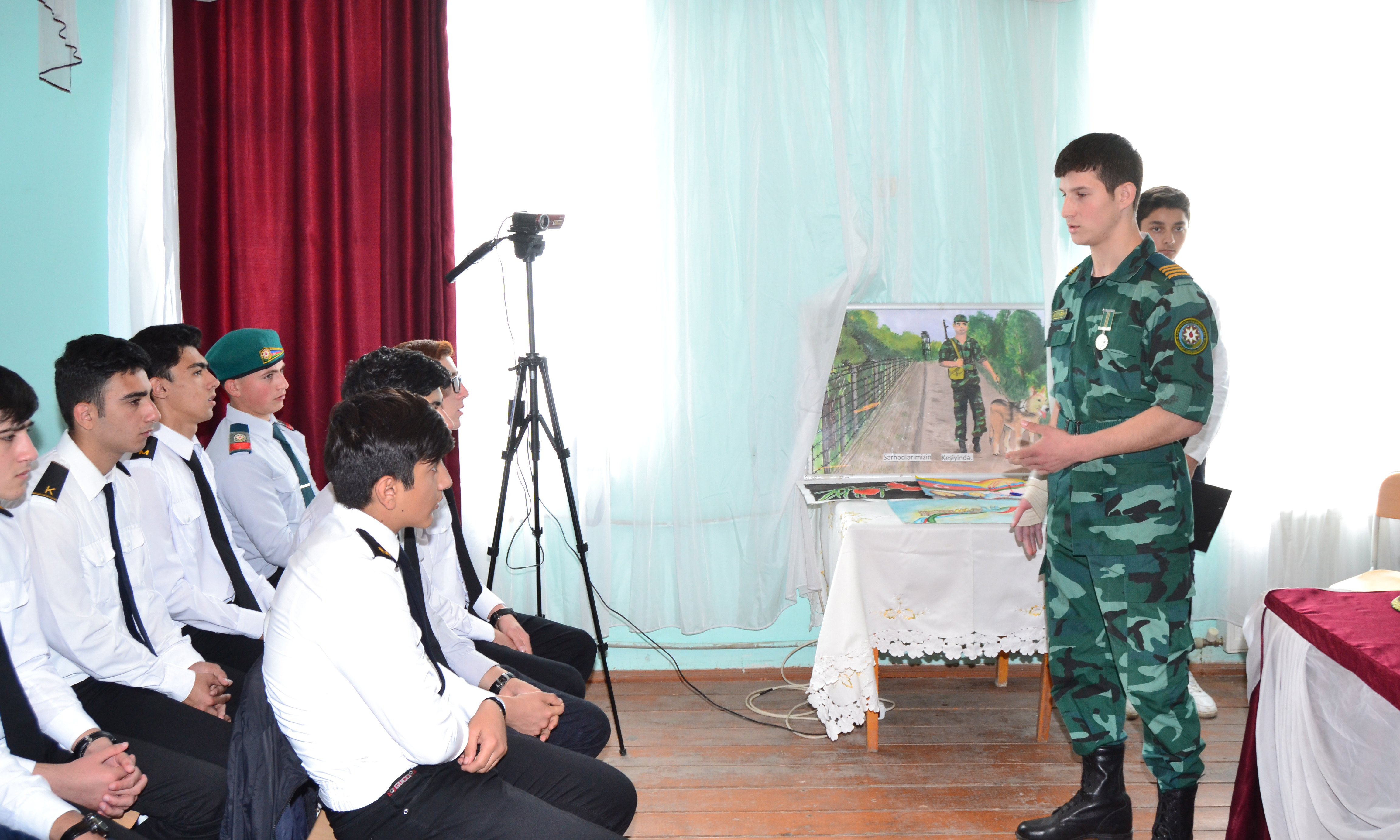 Sonra baş çavuş R.Kurupov şagirdlər qarşısında çıxış edərək deyib ki, Vətən müqəddəsdir. Hər bir Azərbaycan oğlunun borcudur ki, Vətən qarşısında öz vəzifələrini layiqincə yerinə yetirsin. Bunu özünə şərəf bilsin. O, çıxışının sonunda şagirdlərə yaxşı oxumağı, intizamlı olmağı da tövsiyə edib.