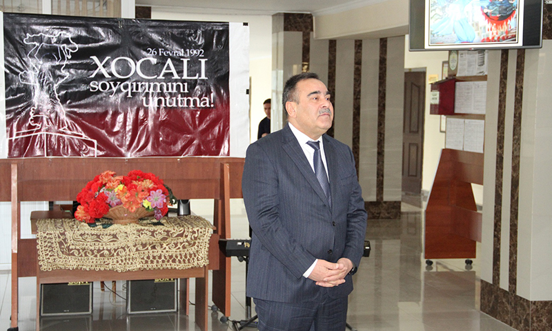 Tədbirdə çıxış edən universitetin rektoru, AMEA-nın müxbir üzvü, professor İbrahim Cəfərov kütləvi qırğının baş vermə səbəblərindən, Xocalının o dövrdə tamamilə başsız qalmasından, bu faciəyə, eləcə də Dağlıq Qarabağ məsələsinə dünya birliyinin ikili münasibətindən danışıb. Rektor deyib: “İndi güclü ordumuz var. Təbii ki, son sözü də Azərbaycan əsgəri deyəcək. Aprel döyüşləri bir daha sübut etdi ki, tökülən qanlar yerdə qalmayacaq, ölkənin ərazi bütövlüyü tam təmin ediləcək”,