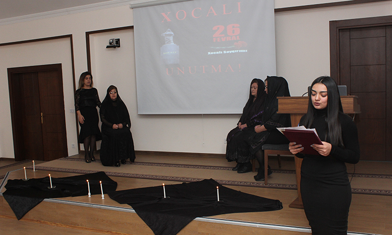 Sonra Xocalı soyqırımına həsr olunmuş videoçarx nümayiş olunub, institutun əməkdaşlarının ifasında Xocalı hadisələrinə həsr olunmuş ədəbi-bədii kompozisiya göstərilib.