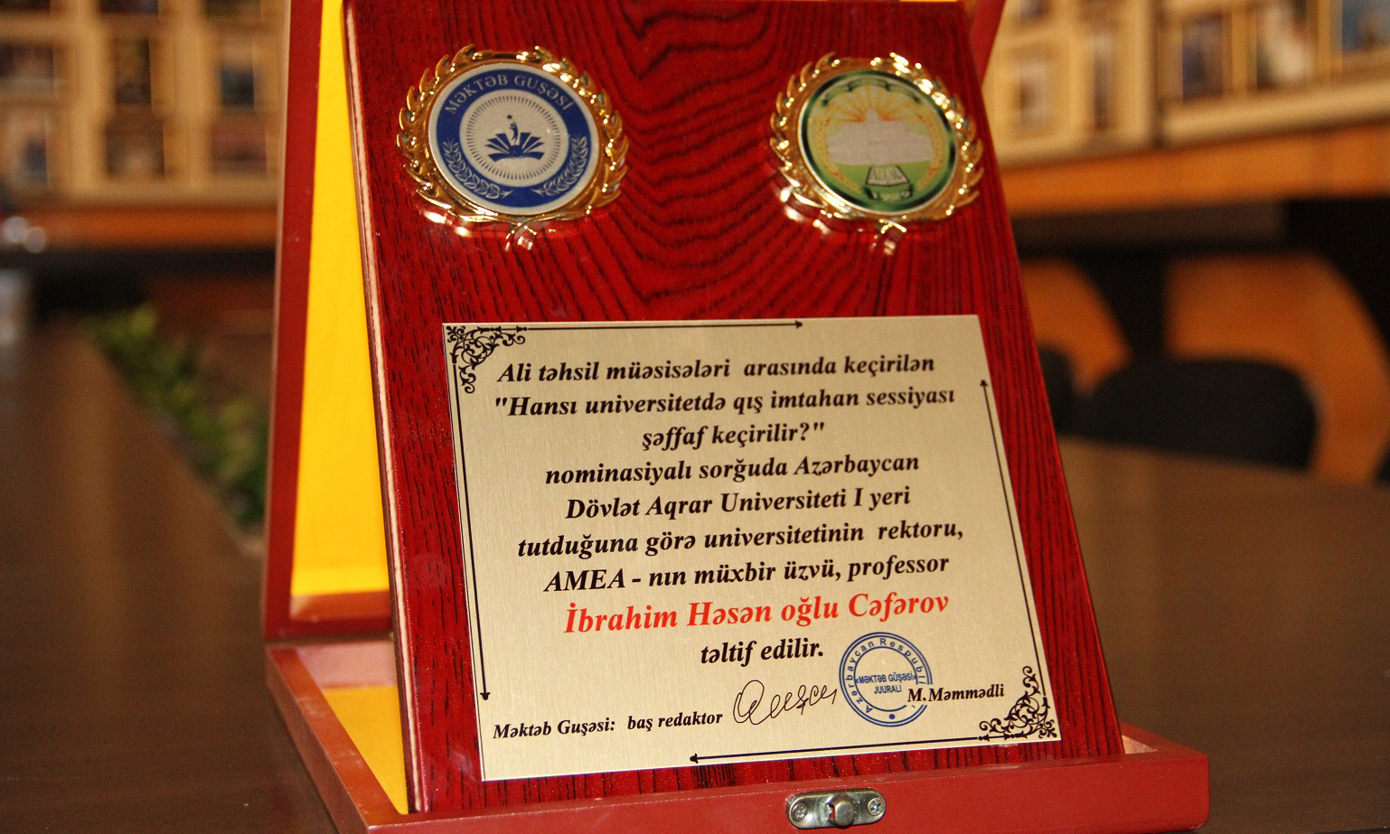 ADAU-nın mətbuat xidmətinin xəbərinə görə, bu barədə diplom bu gün rektor, AMEA-nın müxbir üzvü, professor İbrahim Cəfərova təqdim olunub. Bu məqsədlə keçirilən toplantıda rektor bildirib ki, təhsil müəssisəsinin bütün uğurları, bazar rəqabətli kadr hazırlığı ilk növbədə şəffaf təhsil mühitindən keçir. Şəffaflıq üçün isə şərait və baza olmalıdır. Biz kollektiv olaraq gərəkən işləri görmüşük. Bununla yanaşı İbrahim Cəfərov son bir neçə ildə dövlətin dəstəyi ilə təhsil müəssisəsində həyata keçirilən işlərdən də ətraflı danışıb.