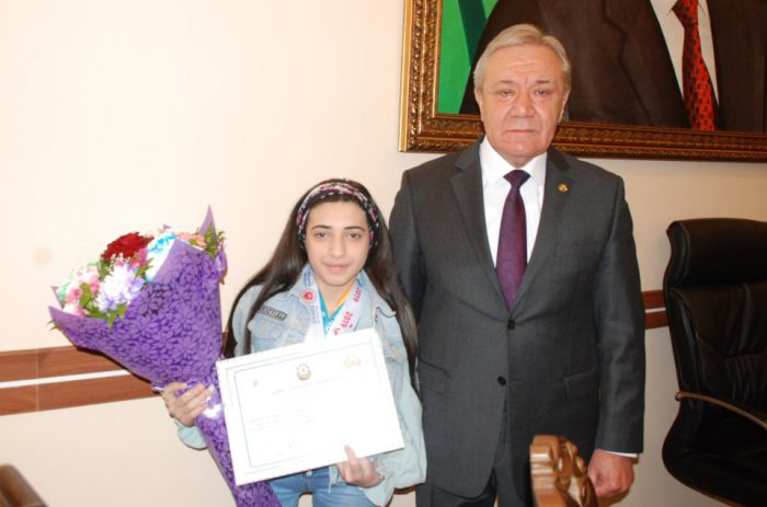 Rektor fəxri fərmanı və pul mükafatını idmançıya təqdim edib.