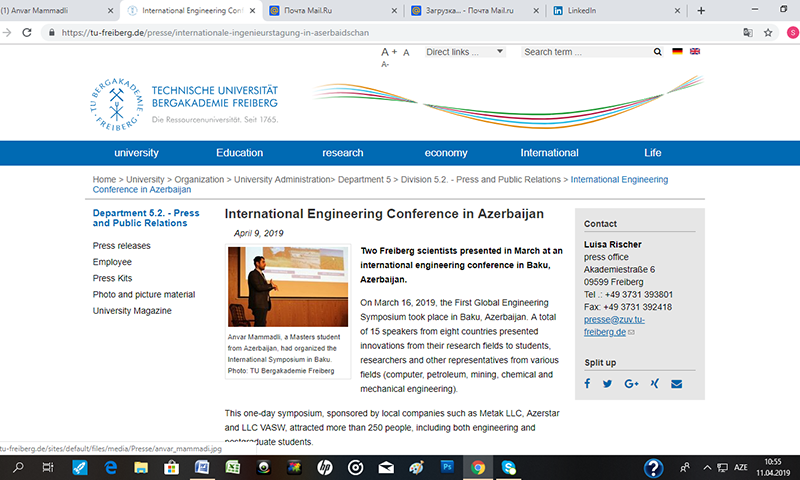 Tədbirdə mühazirəçi kimi adıçəkilən universitetin professoru Feliks Plamper və Dağ-Mədən və Tikinti İnstitutunun professoru Corc Barokusun Frayberge Texnik Universitetinin mühəndislik işi üzrə təhsil proqramlarının mərizəçiləri olduğu qeyd olunur. Qeyd olunur ki, simpozium tamamilə təlim üzrə "Horizon" Agentliyi tərəfindən təşkil edilib. "Horizon Education Agency Dipl" komandasının lideri Ənvər Məmmədli hazırda Frayberq Universitetində beynəlxalq magistratura proqramı üzrə təhsil alır.