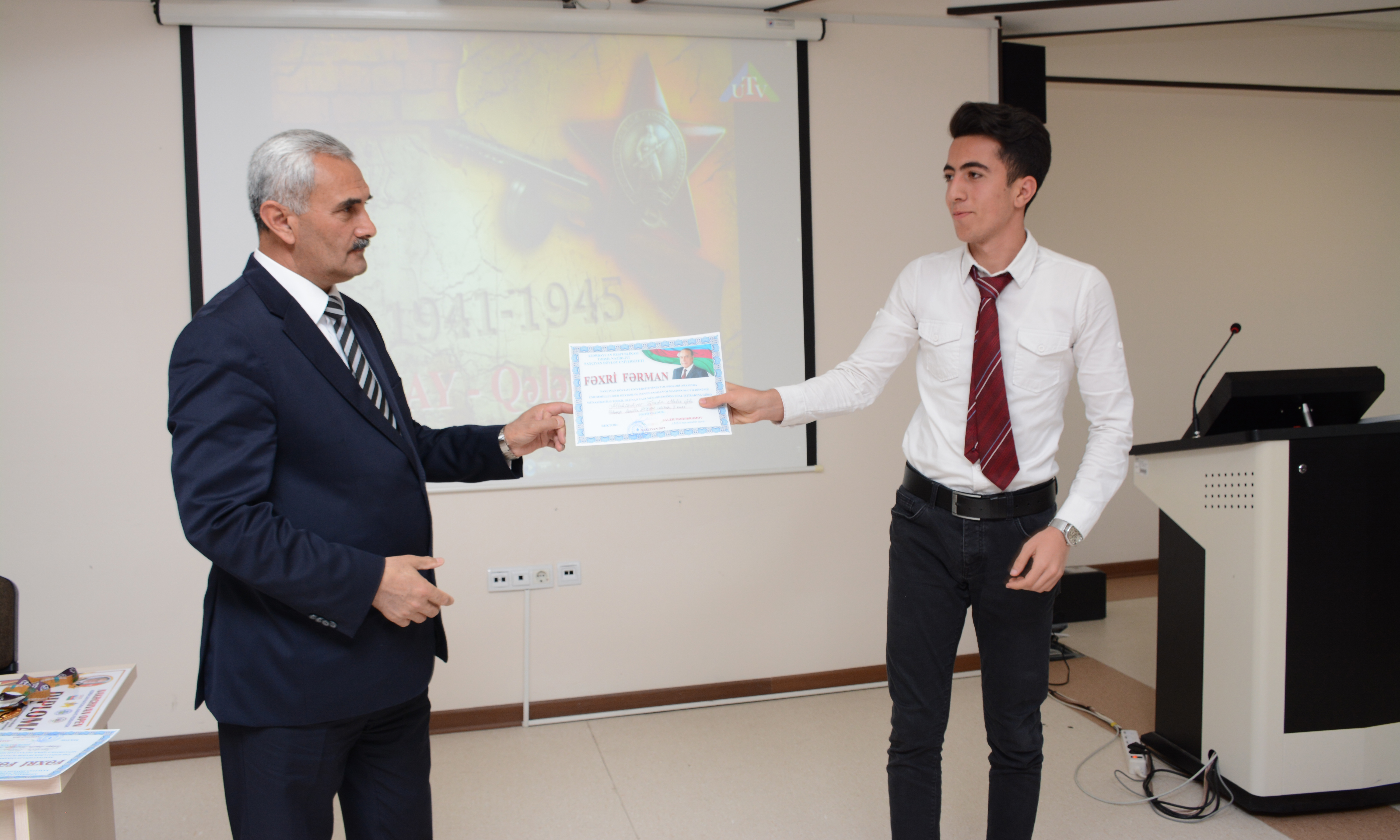 Tədbirdə texnologiya müəllimliyi ixtisası üzrə I kurs tələbəsi Türkanə Həsənova çıxış edərək bildirib ki, müharibədə qəhrəmancasına döyüşən Naxçıvanlılar qələbənin qazanılmasına öz töhfələrini veriblər. 402-ci diviziya Naxçıvanda formalaşdırılaraq cəbhəyə yola salınıb, göstərdikləri igidliklərə görə 3 həmyerlimiz Sovet İttifaqı Qəhrəmanı adına layiq görülüb, bir nəfər “Şöhrət” ordeninin hər üç dərəcəsi ilə, müharibə iştirakçılarından 600-ə yaxını isə orden və medallarla təltif olunub.