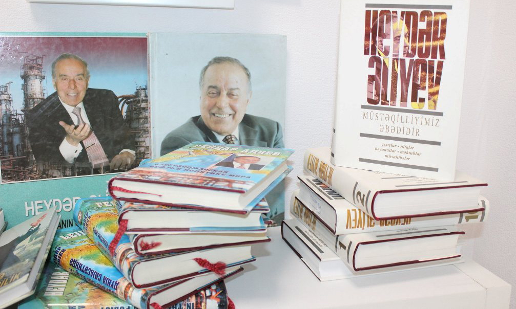 Qurumun İctimaiyyətlə əlaqələr bölməsindən verilən məlumata görə, sərgidə “Milli mənəvi dəyərimiz”, “Üstün zəka”, “Heydər Əliyev və Azərbaycanda milli siyasət” (H.Orucov), “Azərbaycanda aqrar islahatlar” (Q.Məmmədov), “Millətin atası” (H.Mirələmov), “Xilaskar” (E.Elduası), “Böyük öndər” (E.İsmayıl), “Heydər Əliyev və kinematoqraf” (A.Kazımzadə), “Heydər Əliyevin dil siyasəti” (V.Əliyev), “Heydər Əliyev və Azərbaycan dövlətçiliyində qadın məsələsi” (M.Həsənova), “Müdrikliyin zirvəsi” (B.Sadiq), “Heydər Əliyev və Azərbaycanda kitabxana işi” (A.Xələfov), “Bir taledə iki ömür. Xatirələr və düşüncələr” (T.Yəhyayev), “Гейдар Алиев и русская культура”, “Heydər Əliyev. Müstəqilliyimiz əbədidir” və digər kitablar nümayiş olunur.