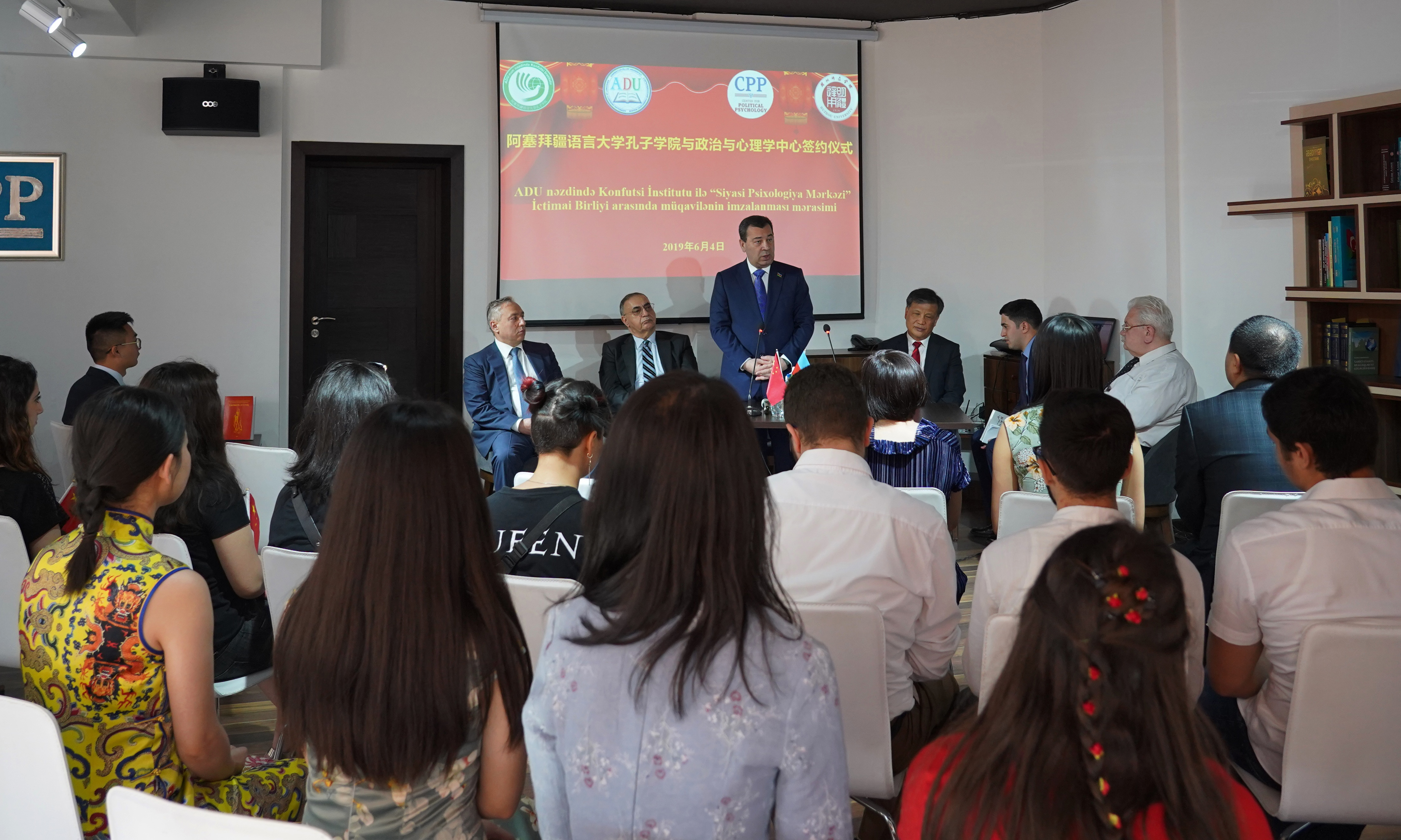 Tədbirdə çıxış edən Çin Xalq Respublikasının Azərbaycandakı səfiri cənab Vey Cinxua Siyasi Psixologiya Mərkəzində Çin dili tədris mərkəzinin açılışının Çin-Azərbaycan münasibətlərinin inkişafına və Çin-Azərbaycan Parlamentlərarası mübadilələrə tövhələr verəcəyini bildirib. O, həmçinin ADU nəzdində Konfutsi İnstitutu ilə Siyasi Psixologiya Mərkəzinin birgə səyi nəticəsində böyük sayda Çin dilində danışan diplomatlar, deputatlar və gənc liderlərin yetişdiriləcəyinə inamını vurğulayıb.