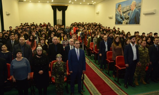 Universitetin rektoru Şahin Bayramov tədbirin keçirilməsində əsas məqsədin tələbə-gənclərin vətənpərvərlik ruhunda tərbiyə olunmasından, onlarda dövlətimizə və milli-mənəvi dəyərlərimizə hörmət hissinin aşılanmasından ibarət olduğunu bildirib. Ümummilli lider Heydər Əliyevin Azərbaycançılıq idealogiyasının inkişafı sahəsində misilsiz xidmətlər göstərdiyini xatırladan Ş.Bayramov hazırda ölkə başçısı İlham Əliyevin rəhbərliyi altında ölkəmizin iqtisadi qüdrətinin davamlı artdığını və ordumuzun gücləndiyini vurğulayıb. 2016-cı ilin aprel döyüşləri şəhidlərinin valideynlərinin, aprel döyüşləri şəhidinin övladının və həmin döyüşlərin iştirakçılarının tədbirə qatılmasının önəmini xüsusi vurğulayan rektor vətənin bütövlüyü və Azərbaycanın müstəqilliyi uğrunda canından keçən şəhidlərin əziz xatirəsinin daim hörmət və ehtiramla anıldığını bildirib.